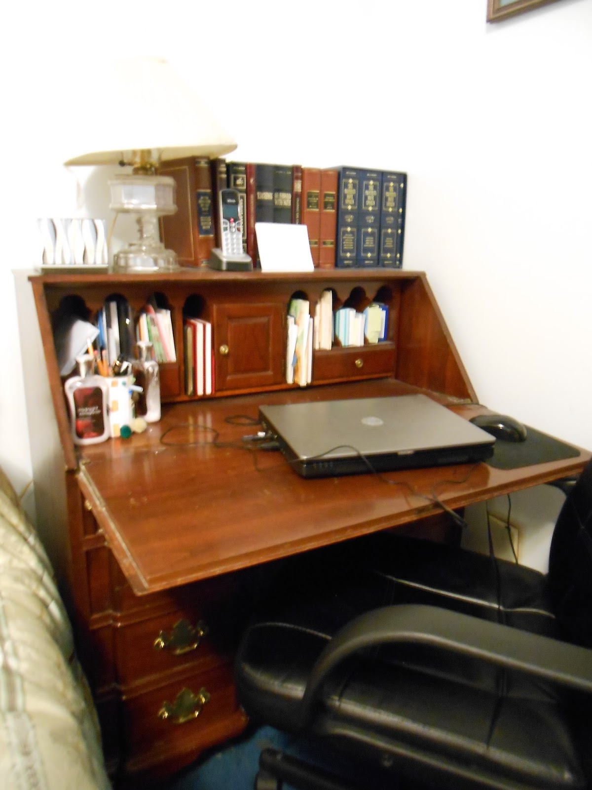 The desk where I do most of my wriitng.Most novelists have many of the same excuses. Though it’s now acceptable for women to publish novels, it’s not really acceptable for anyone other than a published author to admit she’s writing a novel. We’re luckier than Jane, in that we have word processors, laptops, and other technology to help us. What we don’t have is time. It takes ingenuity and sacrifice to fit writing into a busy schedule. And, like Jane, we can easily fall victim to discouragement. The moral of Jane Austen’s story for me is this: Write anyway.
