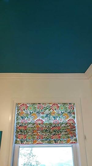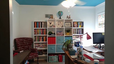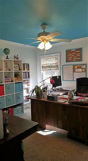 When we first moved to Michigan, I felt a bit displaced. I spent months using the kitchen table as a makeshift office and hated the fact that most of my writerly things were in boxes. We had an area set aside for my future office, but other renovations kept delaying the renovations of my office. One day in an act of frustration, I decided that we did not, in fact, need a guest room, and that room could be put to better use as my office. The bedroom set removed, I was left with an empty room. At first, I had trouble seeing the vision for this room, as I had already designed my office around the previous space, even going so far as purchasing the tile. This room was newly carpeted, so although I briefly considered ripping up the carpet, I couldn’t convince the Hubby it was something we should do. I spent days pouring through Pinterest, and slowly a vision took hold. It was bold, but I thought it would work well for the space. We’ve experimented with color a good deal in the renovations here at what we call The Northern Command Post, so when I told him I wanted to paint the ceiling, he went with it. Still, I think he may have had some misgivings in the beginning. How could he not, even I nearly hyperventilated when I handed the paint sample to the lady and asked for a full gallon. Truthfully, I debated that choice from the time I picked the color until the moment I saw it on the ceiling. But from that instant on I knew I had made the right choice. For the ceiling to work, I knew I needed bright white walls. Surprisingly, the white walls caused me more anxiety than having a bold color on the ceiling, but I also knew I could bring in color with accessories. My vision came together to give me a space that is unique and inviting, and most of all a place that makes me smile. #officemakeover #awriterslife #author #Michiganauthor #Paintedceiling #writersretreat