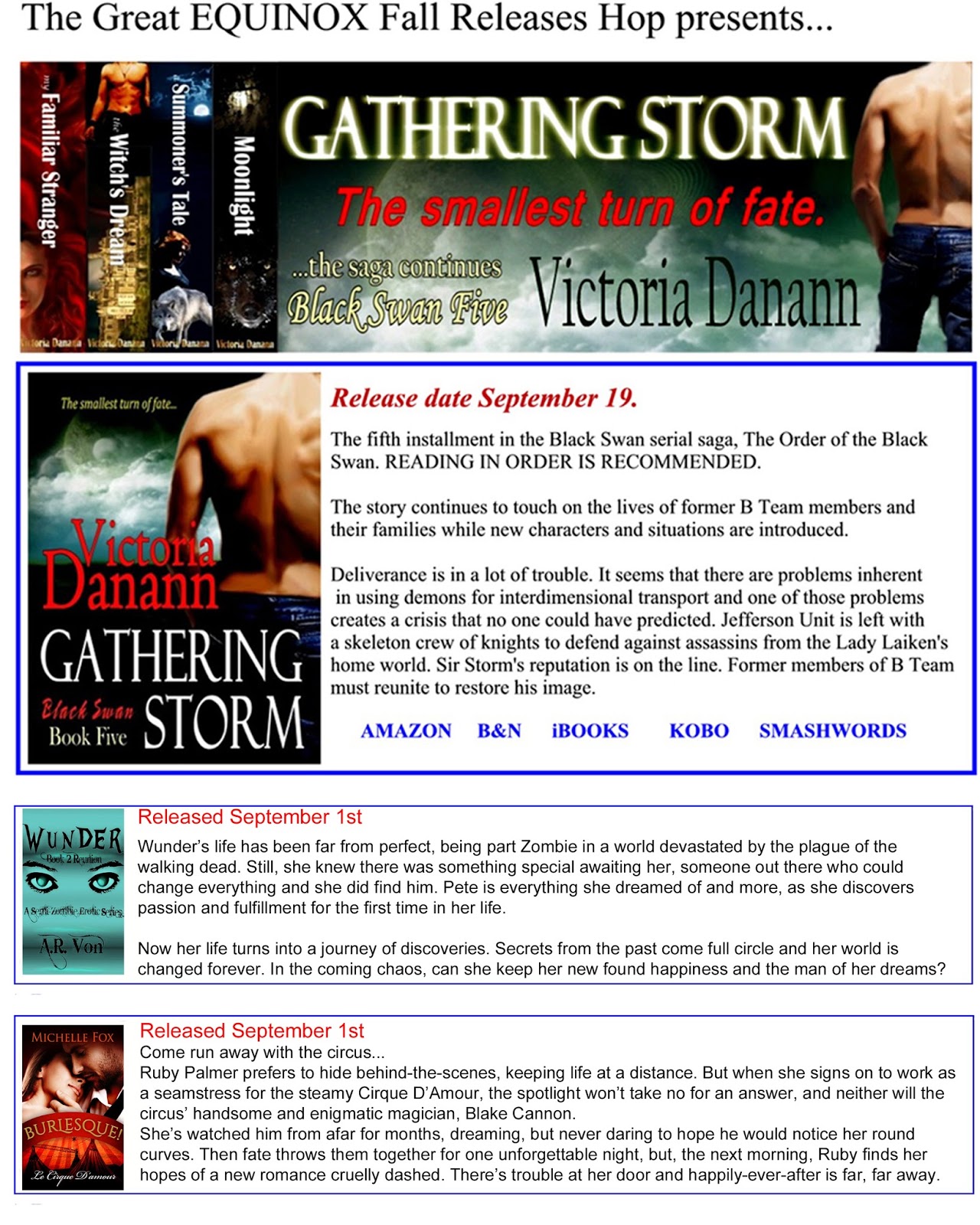 Yay! This is the most awesome Hop ever–one that celebrares the release of a TON of books coming out this fall! Every book in this Hop comes out 1 September -31 December of this year. How fantastic is that?! A big thank you to Victoria Danann and her newest addition Gathering Storm for this awesome Hop!
