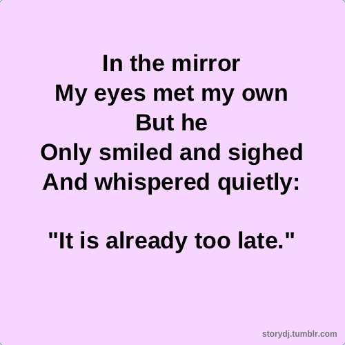 This was inspired by that gulf that probably exists inside a lot of people - who they want to be, and who you are. Of course, this brings with it the urge for change, but then comes the greatest terror of all; thats its too late to change, that its too late for anything, and then the reflection in the mirror just becomes a source of regret, as if it already knows.