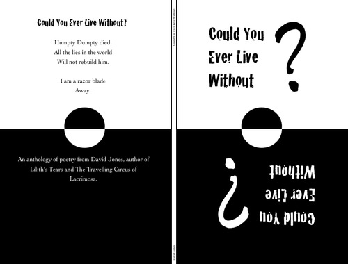The front/back cover and the full cover complete with spine for my upcoming anthology,Could You Ever Live Without?The top image is the full wrap, the bottom is the front and back displayed separately. The back cover is a little hard to read but it says: