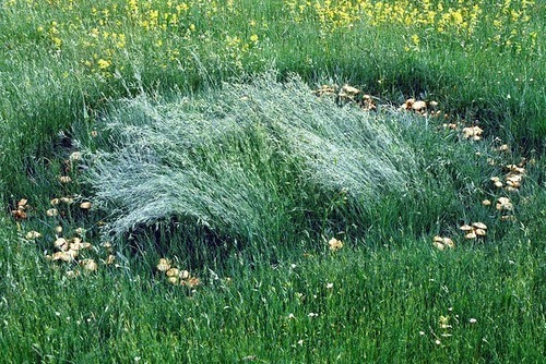 A fairy ring, also known as fairy circle, elf circle, elf ring or pixie ring, is a naturally occurring ring or arc of mushrooms, in his case Marasmius oreades. The body of this fungus, its mycelium, is underground. It grows outward in a circle. As it grows, the mycelium uses up all of the nutrients in the soil, starving the grass. This is the reason a fairy ring has dead grass over the growing edge of the mycelium. Umbrella-shaped fruiting bodies, called mushrooms, spring up from...