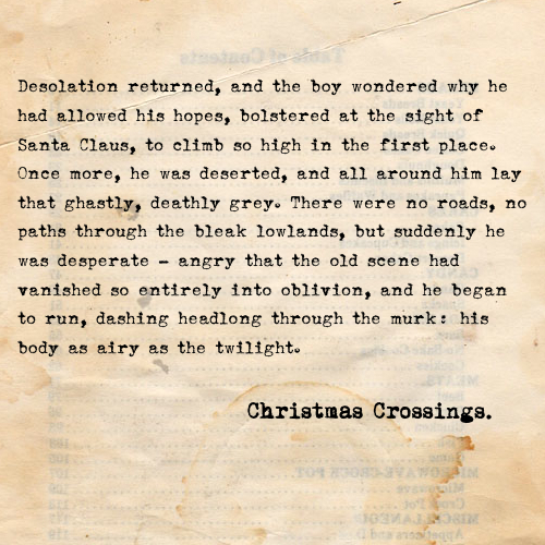 Instead, he wandered a different world, a different universe, to that snowy vision of Christmas Eve. A lifeless, colourless landscape of perpetually grey, desolate twilight held the boy to its dead, empty fields and its dead, empty sky. He roamed for eternity, but still the drained, insipid world of the forgotten dead stretched on with endless, empty monotony. Sometimes, on the horizon, drab, dreary hills or blank undulations would materialize, and thus the boy would quicken his pace towards...