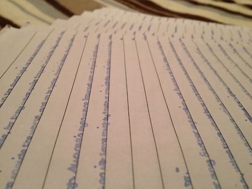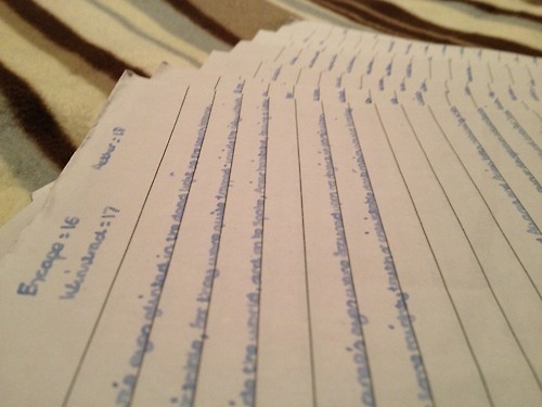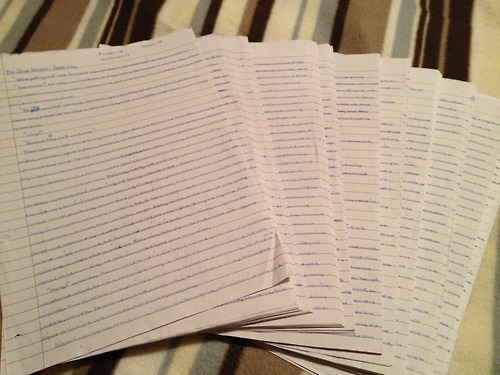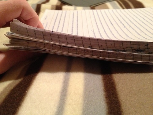 THE BLUE BRICKS PART I IS FINISHED! 321 handwritten pages comprising the first draft. Here it is from various angles. I tried to catch its good side.