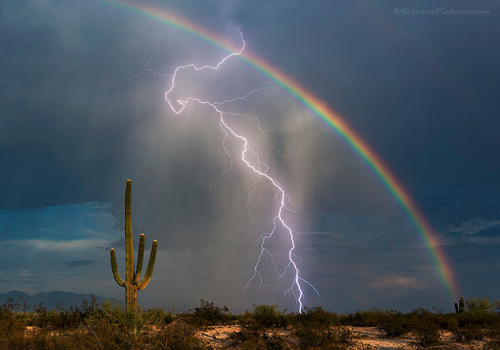 Tucson, Arizona-based photography enthusiast Greg McCown recently managed to capture a shot of a lifetime. While shooting landscapes near the small town of Marana, Arizona, McCown snapped this beautiful photo showing both a lightning bolt and a rainbow in the sky.