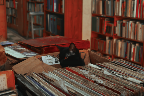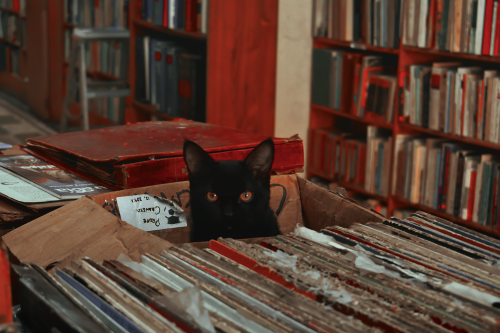 Black Cat sitting in a box at an old bookstore in Mexico City (2016)