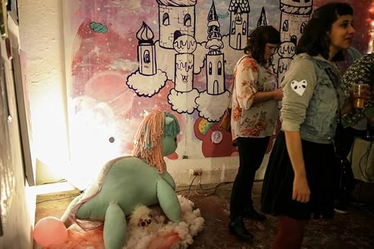 The show itself is a giant installation of cute. Fluffy purple and pink clouds by Laura McPheeters and Katherine Willard hang from the ceiling; the adorable-yet-creepy soft sculptures of Laurie Grace rise from the ground; artwork is scattered frenetically all over the walls, bordered by Christmas lights and chains of origami stars.