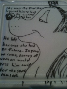 I work at a restaurant, and we are obligated to draw on to go boxes with a sharpie. I have been meaning to refine my shoddy drawing skills, so I have undertaken a wide-scoped guerrilla art project. I normally just let the creations flutter off into the universe stuffed full of pizza and destined for trash cans after, ideally, inspiring a chuckle or two. I particularly liked today’s batch, so I am posting for posterity.It is entitled “The Great Loves of a Meager Skunk”.