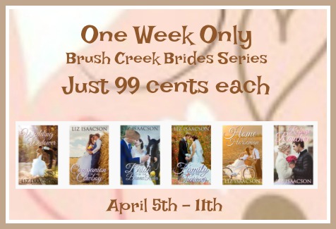 One Week OnlyThe books in the Brush Creek Brides Series are on sale for just 99 cents each!April 5th to 11th