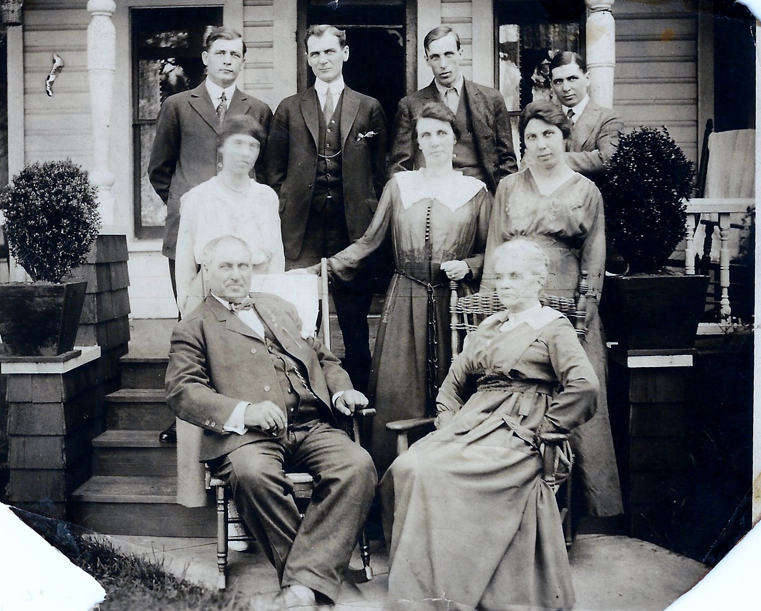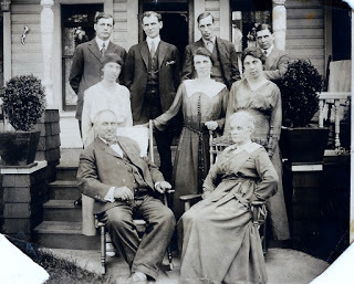 As Carissa and I stood beside Ross Reid's grave and paid our respects, we couldn't help but feel a sense of incompleteness and even sadness at finding two family graves with no markers. We suspect that at the time of their deaths, perhaps their families couldn't afford the headstones. So it's understandable. But I so much wanted to see names there, I suppose for a sense of closure, and also to stand as a monument to those lives. Also, I was disappointed to realize that my great-great grandmother had not been buried beside her husband even though she had obviously purchased an entire section of plots for her family, including herself. The photo to the right is of the Reid family: on the bottom row are my great-grandpa James H. Reid and Margaret Jane Somerville Reid. My great-grandfather, Bertram Wallace Reid, is on the top row on the right end.