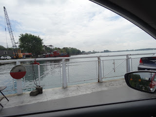 For $10 a round trip, we boarded the ferry (a first for both of us!) and traveled to the island. It's a bit trippy on the ferry because you're moving forward and can see from either side that we are indeed moving, but you can't see in front of you because the huge metal platform is up blocking your view. Felt a little strange.