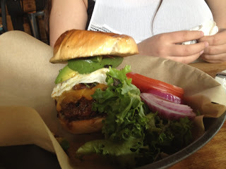 After that, we grabbed lunch at the Schoolhouse Grill on several people's recommendation. Our server, Amanda, was wonderful. And the food was honestly some of the best we've ever had anywhere. Carissa had a build-your-own burger, including avocado, a fried egg, cheese, olives, and mushrooms. The chef called it the slipperiest burger he's ever made. She had to eat it with a knife and fork.