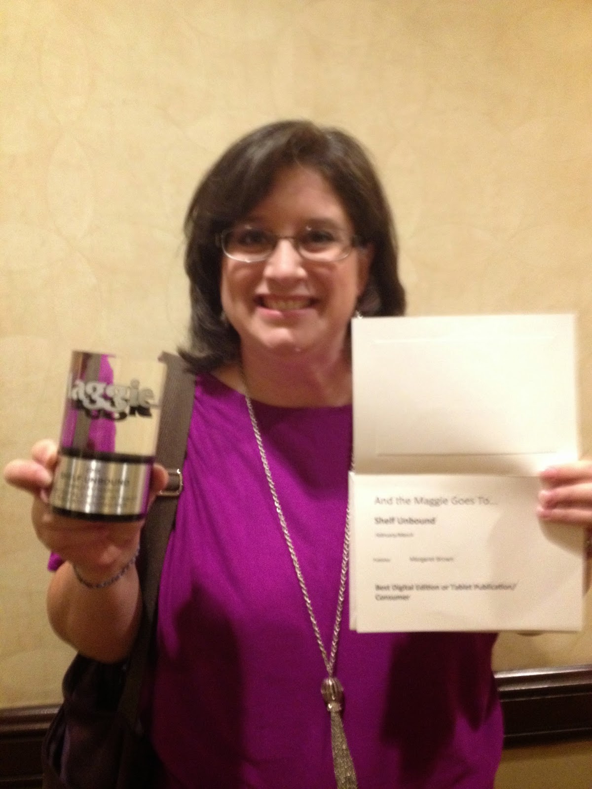 The Maggie's are awarded by the Western Publishing Association, and I am pleased that all three of Shelf Media Groups publications -- Shelf Unbound, Middle Shelf, and Foreground -- were all finalists. But I am especially happy for Margaret, as her magazine is a wonder to behold and she has waited three years for this award.