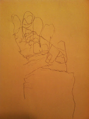 The final shift-inducer was to draw a picture of your hand without ever looking at the paper. The urge to peek is almost overwhelming at times...your left brain is trying to straighten things out. Here is my hand drawn on a taped down piece of paper...and I did NOT peek.