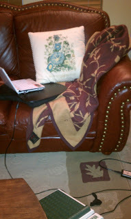 So today is show and tell time. First I'll show you mine: (my comfy spot that is). I'm guessing most readers have one. In truth I'll read pretty much anywhere--in bed, on a chair in my bedroom, in the little girl's room, in a car, in a plane, on a bus or on the train. (Okay, I never really ride a bus or train, but I got on a Dr. Suess roll there.)