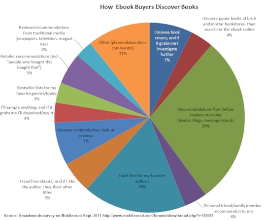 Speaking of e-book sales, the Smashwords blog has an posted the results of an interesting survey on how readers discover e-books. How representative the results are of e-book readers remains to be seen, but the fact that 29% of those surveyed discover books by word of mouth tells me I should start bribing fellow bloggers into recommending my work! Any takers?