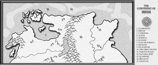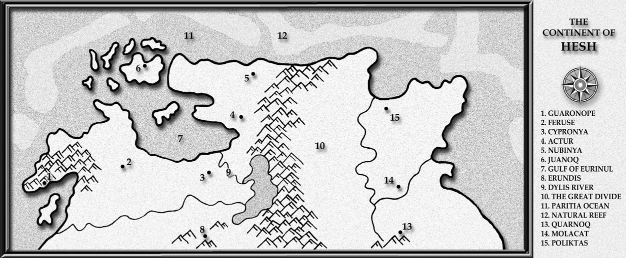 The third map is a close-up of the continent of Hesh. Again, I’ve only noted the major cities/landmarks that are important within the overall story.
