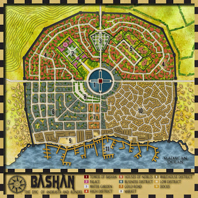 In anticipation of the release of the third volume in The Epic of Andrasta and Rondel within the next couple of weeks, here is a sneak peek of the map for the book. The Tower of Bashan takes place within the city-state of Bashan in the country of Kindi. Andrasta and Rondel are in the city to complete their goal of obtaining the powerful Jewel of Bashan.