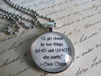 And last, but certainly not least, we have a lovely Coco Chanel quote pendant donated by the lovely Jewelry Designs by Lula. One winner will win this delightful pendant that says A girl should be two things: WHO and WHAT she wants.
