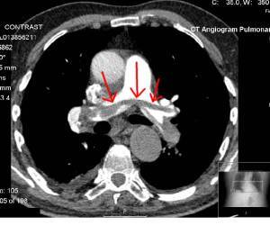 Header Image: IV contrast enhanced CAT scan showing Saddle Embolus (Red Arrows blood clot) lodged across bifurcation of pulmonary artery, Transferred from en.wikipedia to Commons. Author Glitzy queen00 at English Wikipedia. public domain. wikimedia commons.