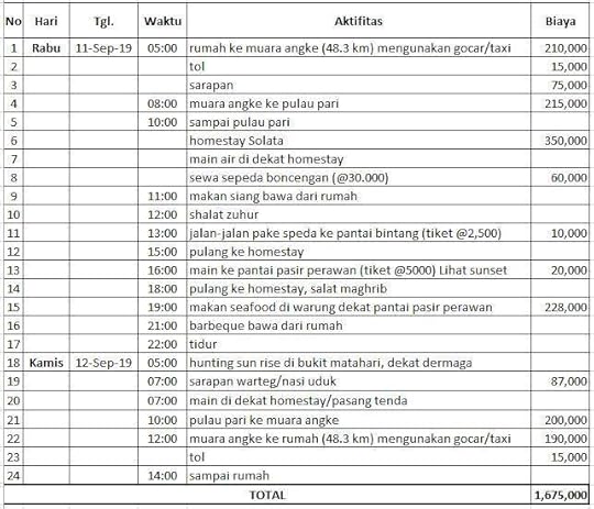 Jika memakai travel agent, untuk empat orang (saya, istri, Nada dan Safa. Aira karena masih 2 tahun jadi tidak dihitung) per kepala dikenakan Rp. 580.000,- s/d Rp. 560.000,-. Sebenarnya harga itu bisa turun, jika orangnya semakin banyak. Sayang (atau yang belakangan saya syukuri) beberapa kawan yang saya ajak tidak merespon.