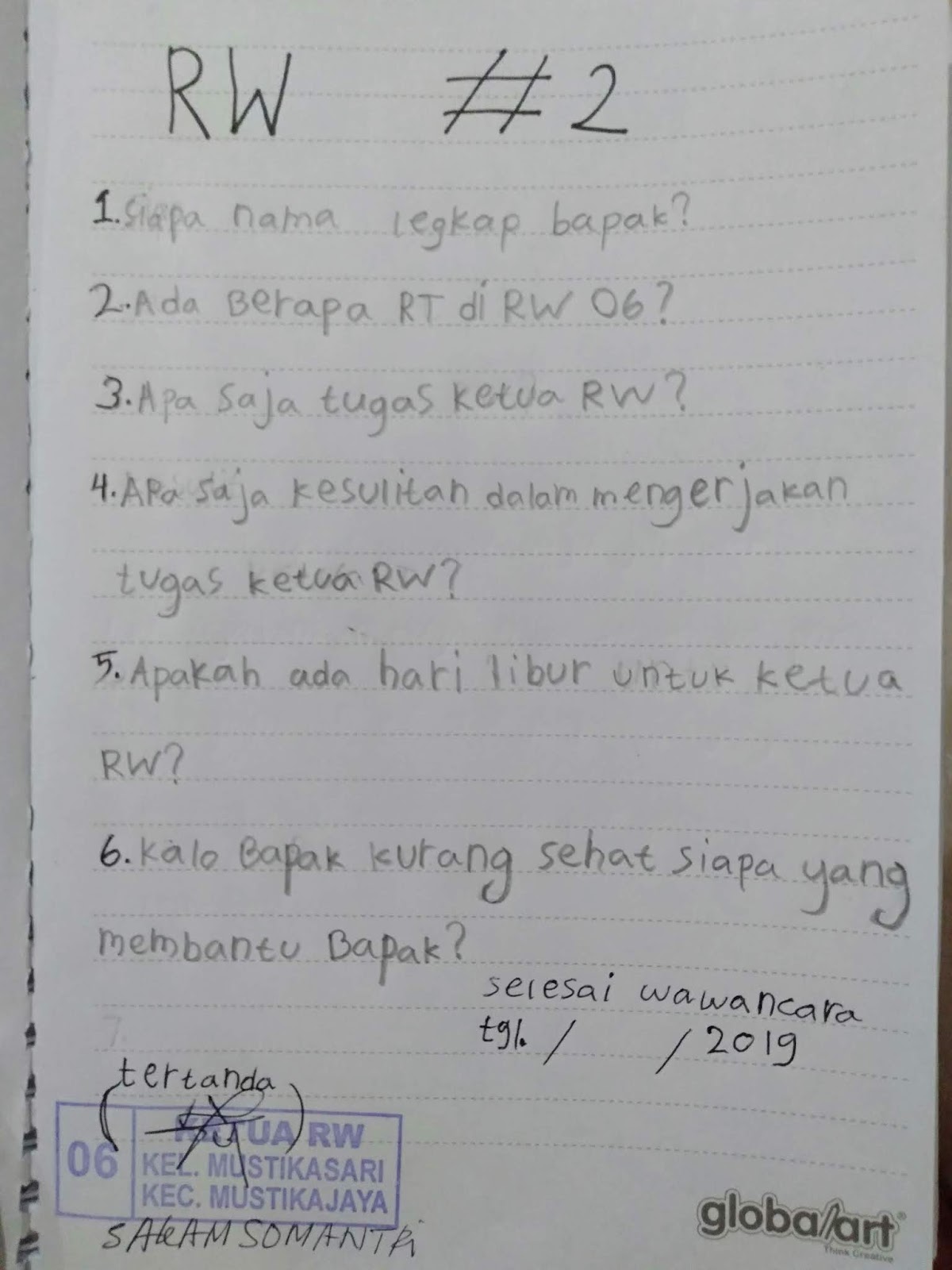 Nama lengkap Pak RW adalah Sakam SomantriRT di RW 06 ada 8 RTTugas ketua RW adalah membina dan mengamankan warga di wilayahnya, memastikan warga membayar PBB dan memberikan surat keterangan administrasi kependudukanKesulitan dalam tugas RW adalah menagih PBB dan kurangnya peralatan penunjang K3Tidak ada hari libur untuk ketua RWSelama menjadi ketua RW, Pak Sakam tidak pernah sakit parah, paling-paling hanya pusing dikit, minum obat warung juga udah sembuh lagi.Sesudah wawancara aku minta stempel dan tanda tangan Pak RW, aku juga minta foto dengannya.