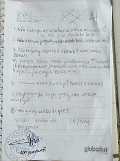 Waktu itu aku ke rumah Pak RW pada pagi hari untuk wawancara, tapi Pak RW tidak ada di rumah, karena sedang menyelawat orang meningeal di RT 01. Kata Bu RW, “Pak RW pulangnya sehabis asar.”