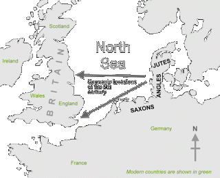 Bahas Inggris Kuno (450-1100): Selama abad ke-5 Masehi tiga suku Jermanik (Saxons, Angles, dan Jutes) datang ke Kepulauan British dari beberapa bagian barat laut Jerman serta Denmark. Suku-suku yang suka berperang dan mengusir penduduk asli ini berbahasa asli Celtic, dari Inggris ke Skotlandia, Wales dan Cornwall. Satu kelompok dari mereka bermigrasi ke Brittany, pantai Perancis dimana keturunan mereka masih berbicara bahasa Breton Celtic sampai sekarang.