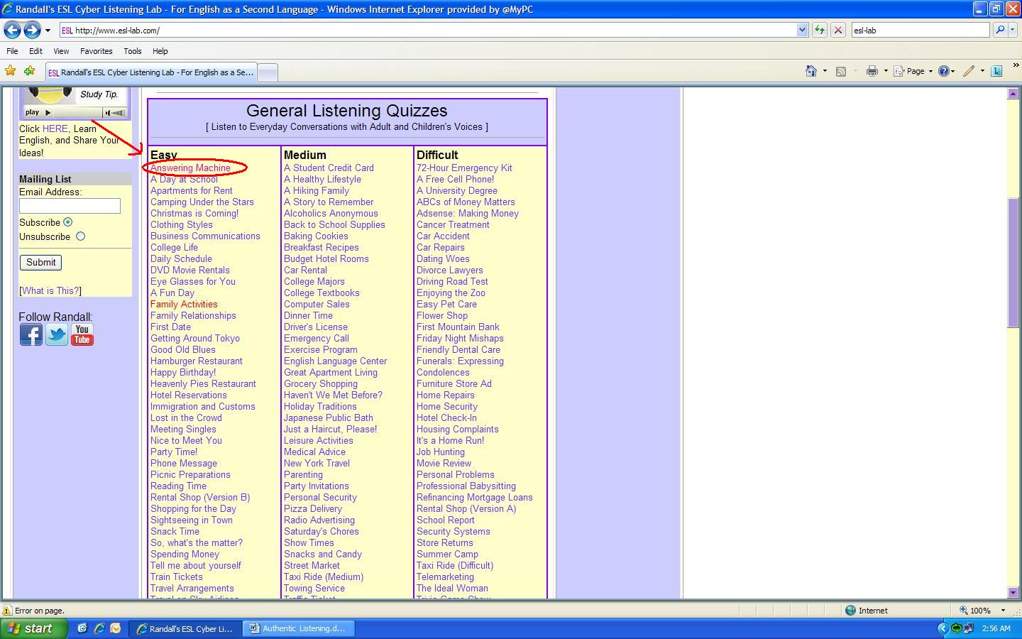 Kamu tinggal memilih level dan topik yang kamu inginkan dengan mengkliknya. Contohnya, kamu memilih level 'Easy' dengan topik 'Answering Machine'. Seperti terlihat di bawah ini: