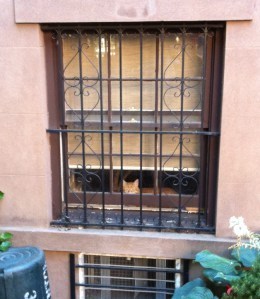 Of course, I took the news of Biscuit’s disappearance very personally, because I like seeing him strut his stuff up and down his block every morning, greeting kids on their way to school. The possibility that he might be gone from our neighborhood and my morning routine indefinitely or permanently deeply saddened me. So every morning I’ve made a point of walking past Biscuit’s apartment like a stalker to see if perhaps he had resurfaced. And today I am delighted to announce that Biscuit’s back! It would appear, however, that he is under house arrest.