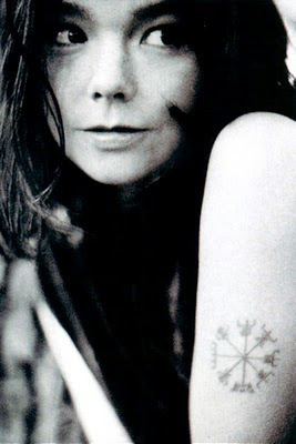 In The Believer’s Daughter, Grace Mathison’s love interest is an unlikely tattoo artist who works in Manhattan’s East Village at a funky store called the Blue Phoenix. The store isn’t really based on any one tattoo parlor in particular, but rather on a whole bunch of them that I remember being around the cool neighborhood (you may have heard of the East Village if you’re a fan of Rent) a few years ago when I resided there (during my pre-Brooklyn period). Owned by a friendly giant named Andy, the Blue Phoenix has a regular clientele of locals as well as the occasional celebrity drop-in. The East Village has been a neighborhood where celebs have gotten tattoos, body piercings, and generally have had no problem finding trouble to get into for decades. Lea Michelle recently got 2 new tattoos at White Rabbit on East 10th Street not too long ago. Rihanna picked up an inking gun at East Side Ink last year and got in a little trouble for practicing her tattooing skills without a license. In the book, famous pop star Tawny drops by the Blue Phoenix on New Year’s Eve to pick out a tattoo, and rules out getting something that would copycat Bjork’s famous Vegvisir (shown below).