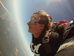 The photo of me was taken Oct 31. My husband had been invited to go skydiving at the navy base in Pensacola. I drove over with him just to keep him company, and ended up being invited to jump, too. (Tandem jumping, of course!) I watched an earlier round of novice jumpers go through the experience and saw how exhilarated they were and decided I’d go for it, despite the 8-page legal release I had to sign. We jumped at 13,500 feet. It really was shockingly non-frightening, no doubt because I had complete faith in the guy I was jumping with. The picture was taken during freefall.