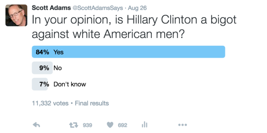 Clinton has her own dog-whistle strategy, largely ignoring the plight of white American men, such as Trump’s supporters. The dog-whistle message I’m getting from Team Clinton is “White men screwed you for years. Time to get even.” Clinton’s exact words are – of course – more about equality and goodness. But as my Twitter survey showed, the dog-whistle has a contrary message. As with Trump, the things you don’t say – or don’t say emphatically enough – carry a message too.