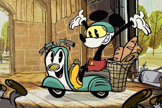 When it comes to showing my Disney Side (clever campaign) I tend to lean toward the theme parks. This means I am not usually a first adopter of a lot of products produced by the other divisions. However, there was one new cartoon series that I have been really looking forward to ever since I saw the preview in March 2013. Under the leadership of Executive Producer Paul Radish, Mickey Mouse has returned, scrubbed of the sanitized corporate symbol attitude, and returned to his roots as a blend of Charlie Chaplin, Errol Flynn, Walt Disney, and the Keystone Cops. Starting last summer, Disney began releasing 19 of these groundbreaking 3+ minute shorts. Gone is the bland, safe Mickey. Enter the Mickey that resembles the one that first captured the public’s attention in 1928. Set in contemporary times, Mickey and his friends are happy to break into a neighbors house to use his pool on a hot day, cheat in a dog show, and steal an ice cream truck. Creating chaos is a given in each episode and at times resembles the energy of a Tex Avery cartoon or one of the Roger Rabbit shorts. In the end, Mickey does save the day and everything turns out right. Just like the original early classic Mickey Mouse shorts, kids will love these but they really are written for adults.In the first episode, Croissant de Triomphe, Minnie runs out of croissants at her restaurant in Paris and calls out to Mickey (in French) to bring more. Mickey jets through the streets of Paris, close calls at every turn, as he tries to get to Minnie in time. The storyboard sessions must have been a blast because the gags that made it to the final cut will make you laugh out loud. It is both timeless and relevant at the same time. The animation is fresh, fluid, rubbery, and throughly 2D. I like this version of Mickey. That was just a start. In No Service we get to see a naked Mickey in a public place. In Yodelberg Mickey gets to meet a yeti and New York Weenie will make you look at hot dogs in a new way. Tokyo Go and Panda-monism show that Mickey is an international star and are set in Japan and China. We have all had a Bad Ear Day. Stayin’ Cool was released when Los Angeles was suffering from an unbearable heatwave and summed up that experience better then anything I have ever seen. Zombie Goofy. Gubbles. This will all make sense as you watch the series. Mickey is alive and well in the hands of this team of animators.