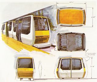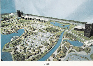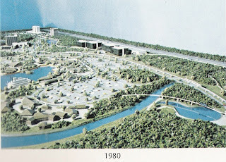 The most innovative part of the plan was the transportation network. At the center of the development would have been a demonstration multi-modal terminal (monorail, taxis, buses, automobiles, electric cars, and pedestrians) that would be connected to the Peoplemover network. This development would represent the “urban” district and consist of parking structures, large scale shopping, and high density hotels and offices.