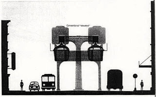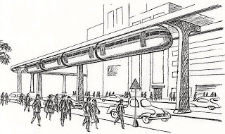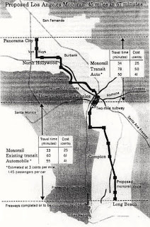 So what happened? The proposal was doomed from the start. The monorail proponents were opposed by two huge political forces; the Pacific Electric Lines (the Red Car) and the Los Angeles Transit Lines. The Los Angeles Transit Lines was run by National City Lines, partially owned by General Motors. Their proposal was a series of express buses along the freeways. Shades of Roger Rabbit. These forces limited the right of way under consideration to a corridor that was the least desirable. They also lobbied the California Legislature to deny access to the Public Utilities Commission and the ability to float tax-free bonds.