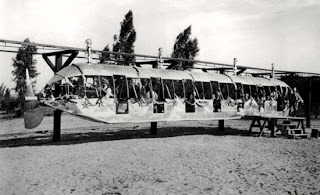 One of the earliest examples was a system designed and patented by inventor Joseph W. Fawkes in 1907. He called it the Aerial Swallow and built a prototype in 1911 with the intention of building a line that would connect Burbank to downtown Los Angeles. He built a quarter-mile test track with a monorail train train that hung from the rail and was powered by a propellor driven by an air-cooled engine. The 40-foot train could travel at 3 mph. The train made its maiden run on July 4, 1911. As investors shied away, the project faded into history.