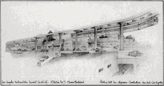 On January 15, 1954, Coverdale & Colitis submitted their proposal for $165 million monorail to the Los Angeles Metropolitan Transit Authority. That would be $1.4 billion today. The study was first begun in 1947. At first, the project was going to be built with private sector funds but in 1951 a public agency was set up specifically to look at the technology. The monorail was deemed superior to a subway or light rail because of the low-density distribution of land uses throughout the region, the high degree of automobile ownership, and the lack of any surface-free mass transit.