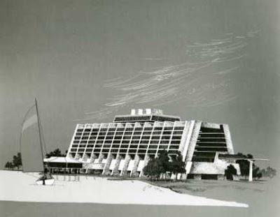 Back in April 1969, it was announced that Disney’s “Vacation Kingdom” would consist of two resort hotels. The 360-room “tomorrow” hotel would include a ballroom/convention center. The 10-story, 750-room Contemporary hotel would be much larger than originally planned. This was the “flagship” hotel on property and was designed with a ballroom capable of accommodating 2,000 guests for banquets and 3,000 in theater-style seating. It’s most notable features would be the “spectacular open-mall lobby longer than a football field, with an 80-foot ceiling” and the Walt Disney World-Allege monorail train running through the space.