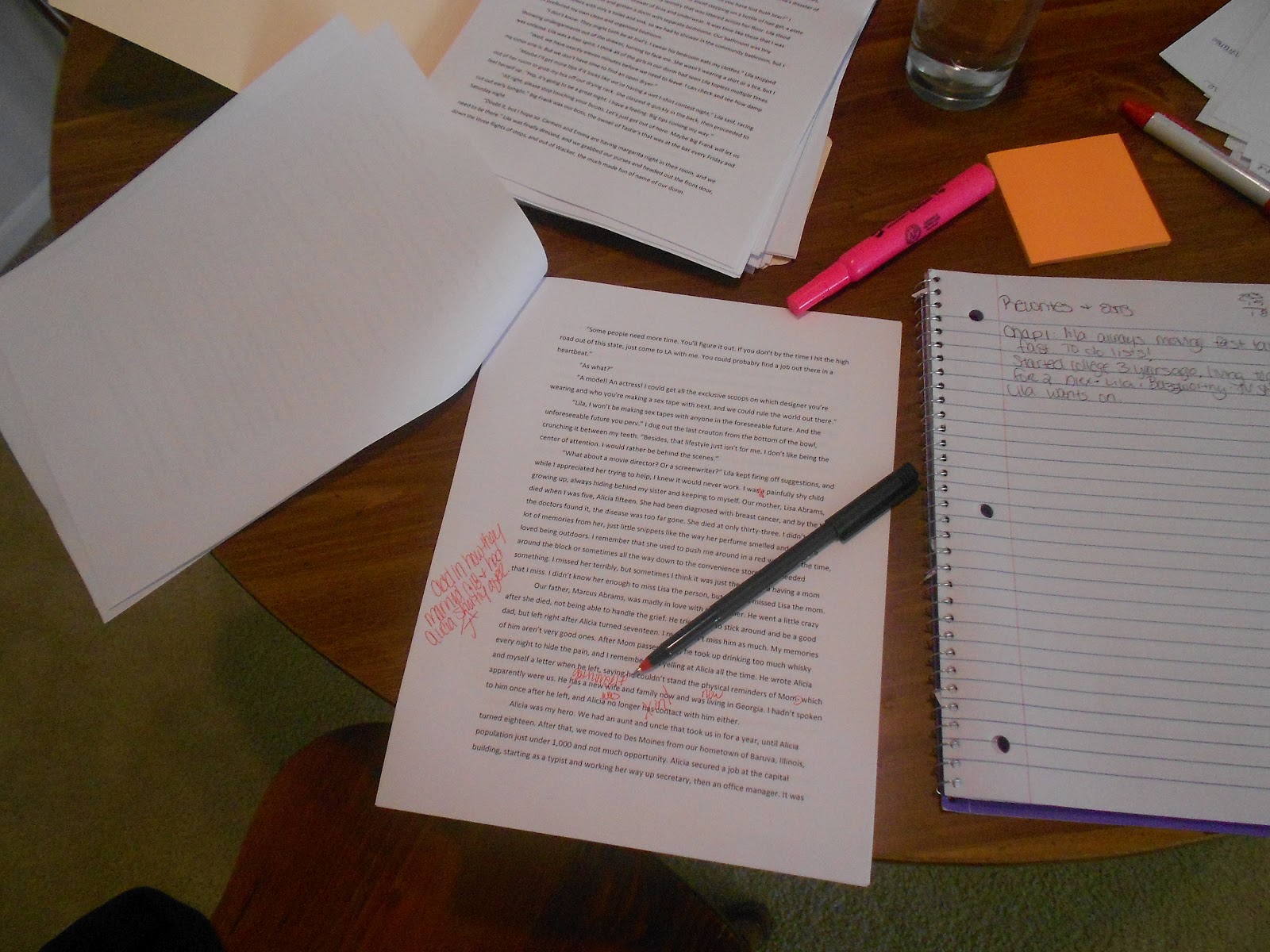 Ah, finally. The first draft of book #2 is complete! Typing those last words (which I'm sure will get changed in the revising process) took a huge weight off my shoulders. That weight was lifted for about, oh, five minutes, give or take. Then came the printing of all the chapters, quickly followed by me dusting off the red pen. Bring on the edits! I started reading through everything last week, marking up my pages with the red pen and highlighter (see photo), and filling countless pages in my notebook with scenes that need rewritten, content that needs added or deleted, etc, etc. I started working on this book back in October when Destinedto Fail was being edited, and I don't edit my work as I go. Let me rephrase that – when I write, I write chapter by chapter. I start from the beginning and write until the end. Once a chapter is complete, I go back and re-read the chapter and fix any glaring typos, but I leave all the heavy editing until the end. My reasoning is that I don't want to get too caught up in the edits, I want to keep writing and reaching my word count goals and keep the story flowing.