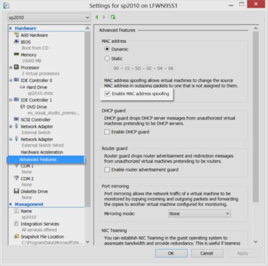 The solution in my case was found in a hint from a fellow SharePointer from the Windy City, Nik Patel. I saw Nik’s comment in a TechNet forum saying how hard it was to find the Advanced Features of the Network Adapter in Windows 8. I had found that on a search for "enable spoofing of mac addresses." I saw that feature while reading this SmoothWall Express post showing the setting in a different version of Hyper-V. SmoothWall had been suggested as a way for me to get NAT in Hyper-V, but now I’ve found I don’t need it after all.