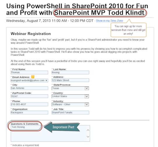 For every Webinar Registration that has my name in the registration form comments box I’ll put an entry in the Magic Hat for the book drawing. If I get more than 1 registration with my name in the comments form, I’ll mail out 1 copy of SharePoint 2013 Inside Out signed by a co-author, moi! If there are more than 50 with my name I’ll send out 2. If more than 100, I’ll mail and sign 3!