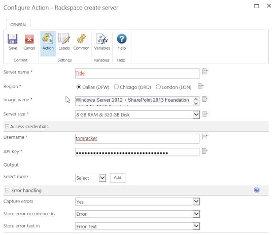 Note that you will need a Rackspace Cloud Server account, free with registration, to get the username and API Key needed to create a server. I chose to use the title of my new SharePoint list item as the name of my new Server instance.