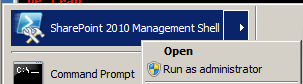 This error occurred when I entered the farm account name, sp_farm, without the domain’s shortname. Even when I entered the domain name in front of the user name, Rackspace\sp_farm, I received this error again. After some trial and error and research, it appears that you have to exit the Shell after the first time you receive the error or you will receive it again, even with the proper domain\username form.