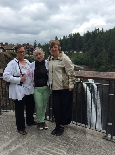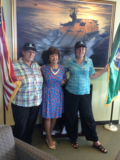 Sybille and Gundi were the perfect house guests and I hope we were the perfect hosts. We gave it our best shot for two weeks, taking the ladies all around the Pacific Northwest. They got to see a waterfall for the first time, had a day at an American shopping mall and found several goodies on sale, went for a boat ride (thank you Susan Wiggs, boating queen!), visited Debbie Macomber's office and had lunch with the amazing Debbie, had lunch at the Seattle Space Needle, took a ferry boat ride, went to the ocean, had root beer floats and a banana split, saw Mt. St. Helens, shared meals with friends,and learned how to country line dance. We were busy every day of the week. A big highlight was getting to meet our charming mayor of Bremerton, Mayor Patty Lent, who treated them like rock stars, pinned our Bremerton lapel pin on them and gave them each a Bremerton ball cap.