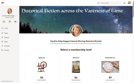 Spun Stories is going to be replaced by Cynthia Sally Haggard (there will be a 6-month transition period for all of you to get used to this)As part of this revamp, I’m going to move my blog to Patreon.As patrons of Patreon, however, you will not only get EXCLUSIVE content in the form of my twice-weekly blog (for $3/month) butFor $6/month you get EXCLUSIVE content in the form of never-before-published fictionFor $9/month you can participate as a COLLABORATOR as I write my novels, giving you EXCLUSIVE access to my writing process and to UNPUBLISHED DRAFTS.Intrigued?