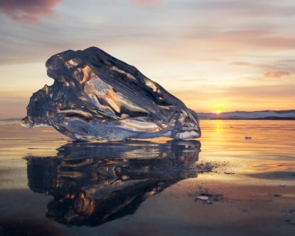 A piece of ice lying on the frozen surface of Lake Baikal at dawn.Once upon a time, a fatherless child emerged from an area of harsh mountains.