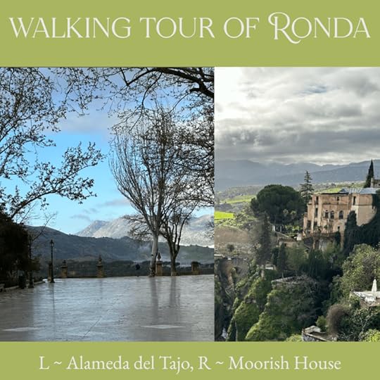 Today we went on a walking tour of Ronda, with local guide Marta. By now, the howling wind and pouring rain of yesterday had ceased, and the weather improved. Nevertheless, it was cold enough (48 degrees) for me to wear my puff jacket as we set out at 9:30. Marta first took us to the bullring, left over from the 18th century and talked a lot about bull fighting. Then she took us to the Alameda del Tajo. Alameda means “promenade” in Spanish and Tajo is the name of the river and also means “cut.”