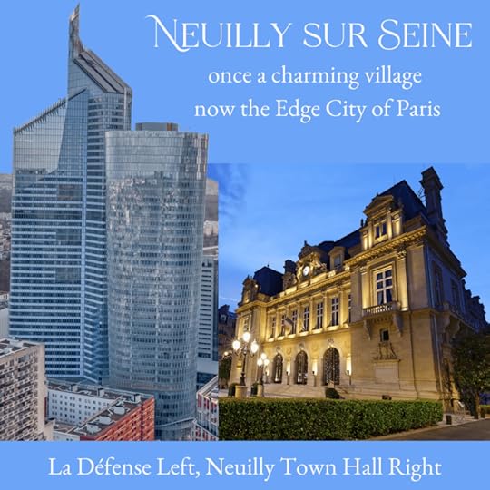 Neuilly, once a charming village, is now on the outskirts of Paris, on the other side of the Péripherique, another nightmare of traffic if you are driving a car. Neuilly is still charmiing (many rich people live there), but just as Georgetown in Washington DC is spoiled by the tall towers of Rosslyn, so Neuilly is marred by the tall towers of La Défense, a major business district that houses the usual sorts of things, including many insurance companies.