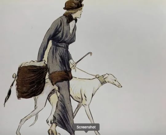 It is 1914, just before World War I and here is an elegant lady with her greyhound (costumed by Chanel). Notice how clean & modern the lines are. Yes that is a large muff (in case you were wondering.) But what about that skirt? I first heard about it from Grandma Steffi who turned 20 in 1914, and it had a special nickname. My grandmother referred to it as a hobble skirt.